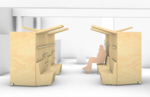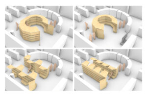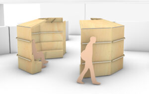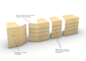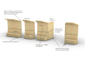 Je propose un ensemble de 9 modules sur roulettes permettant un large choix de configurations. D’une hauteur inférieure à 2m20, ils peuvent passer toutes les portes.
