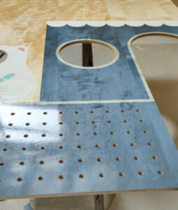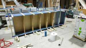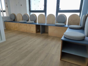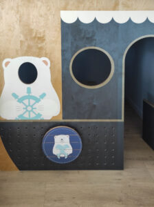 Réponse : création d’une borne d’accueil en forme d’iceberg avec un escalier pour permettre aux enfants d’être à la hauteur des adultes, d’une grande étagère de rangement, d’une banquette pour la salle d’attente et d’une cloison jeu pour faire patienter les enfants.
