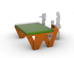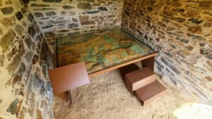 L’Écomusée des Monts d’Arrée avait besoin d’une vitrine pour présenter une grande maquette du territoire. Il souhaitait que le mobilier face écho aux bancs déjà présents sur le site de la Maison Cornec.