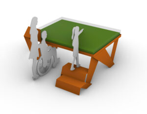 Je dessine une table en acier plié et ajoute un escalier pour permettre aux personnes de petite taille de découvrir confortablement cette maquette monumentale.